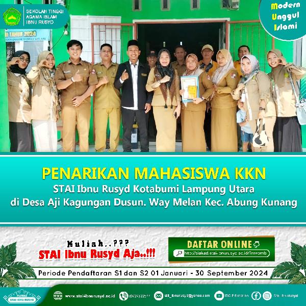 Kuliah Kerja Nyata (KKN) STAI Ibnu Rusyd Kotabumi yang dimulai sejak tanggal 1 Agustus hingga 31 Agustus 2024 telah selesai dilaksanakan. Dosen pendamping KKN STAI Ibnu Rusyd Kotabumi melakukan penarikan mahasiswa KKN pada tanggal 31 Agustus 2024 di Desa Aji Kagungan Dusun Way Melan, Kecamatan Abung Kunang, Kabupaten Lampung Utara.